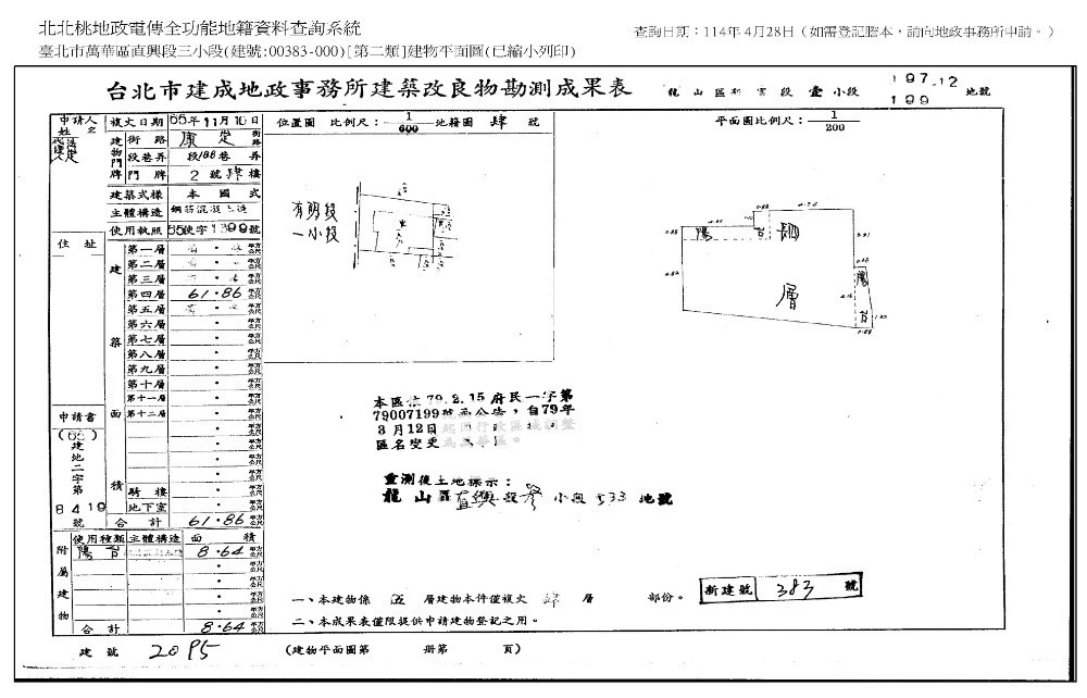 2‧本件383建號建物有公共樓梯及一個內梯,內梯與一、二、三、五樓相通,公共樓梯之四樓大門內有門栓鎖住無法開啟,本院係經三樓房屋所有權人之友人持鑰匙從一樓側門進入,經由內梯自一樓通往四樓進行履勘。土地使用分區為第四種商業區。