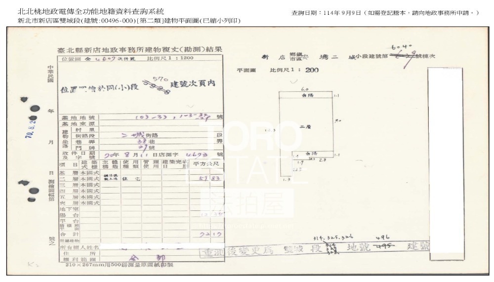 1‧本件拍賣標的496建號建物據本院現場履勘時大門深鎖,無人應答,經債權人表示以目視外觀應無增建。據地政人員指界稱,本件拍賣標的2地號位於門牌號碼新店區安康路3段355巷(下同)2號西方約10公尺處,其上有守望相助隊守衛室、涼亭、停車場、鐵皮屋;標的3地號位於門牌號碼2號至10號後方約2至6公尺不等之土地;標的100地號位於門牌號碼26號至28號後方約1公尺處;標的100-1地號位於門牌號碼22號至28號後方約2公尺處;標的101地號位於門牌號碼32號至34號後方相鄰之土地;標的101-1地號位於門牌號碼36號至38號後方相鄰之土地;標的101-2地號位於門牌號碼32號至42號後方約2公尺處;標的101-3地號位於門牌號碼40號至42號後方相鄰之土地;標的106地號位於門牌號碼42號南方相鄰之空地;標的248地號位於門牌號碼1號西北方約15公尺處之道路;標的250地號位於門牌號碼2號西方相鄰之土地,其上有守望相助隊守衛室、道路、涼亭、停車場、鐵皮屋;標的250-1地號位於門牌號碼2號西方相鄰之土地,其上有停車場、鐵皮屋;標的294地號位於門牌號碼2號後方、4號前後右方、6號前後左方、8號前後方、10號至16號後方,18號、20號、30號、32號前後方及22號至28號後方相鄰之土地;標的294-1地號位於門牌號碼2號至10號後方約2至5公尺不等之土地;標的294-2地號位於門牌號碼12號至14號後方約3公尺處;標的294-3地號位於門牌號碼22號後方約2公尺處;標的306地號位於門牌號碼30號、32號前後方相鄰之土地。標的3、100、100-1、101、101-1、101-2、101-3、294、294-1、294-2、294-3、306地號土地,其上有隔壁建物所增建之鐵皮屋。惟上皆鄰建物增建之鐵皮屋占用土地權源不明,拍定人須自行解決占用鄰地之法律關係,且上皆鄰地增建鐵皮建物等均不在拍賣範圍內,請應買人注意。標的2、3、100-1、101-2、250-1、294-1、294-2、294-3地號土地之使用分區為道路用地,標的100、101、101-1、101-3、106、250、294、306、314、325、326地號土地之使用分區為已開發建築密集地區,標的248地號土地之使用分區為溝渠用地,移轉上之相關限制請拍定人自行查明。