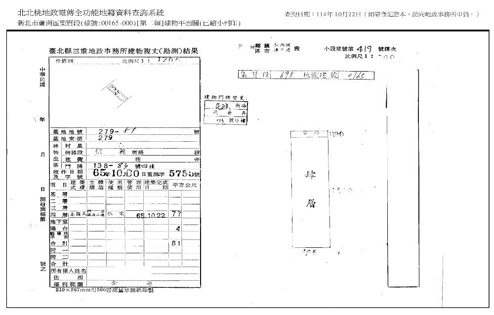 1‧本院於113年10月22日到現場查封時,現場無人應門,惟仍留有大量傢俱電器等雜物;4樓屋內有內梯通往5樓,屋內有漏水痕跡、牆壁龜裂、鋼筋外漏之情形;頂樓增建部分前後均有陽台,後陽台似置放整棟樓之水塔。經函請新北市政府警察局蘆洲分局查訪,該址現無人居住使用。拍定後點交。