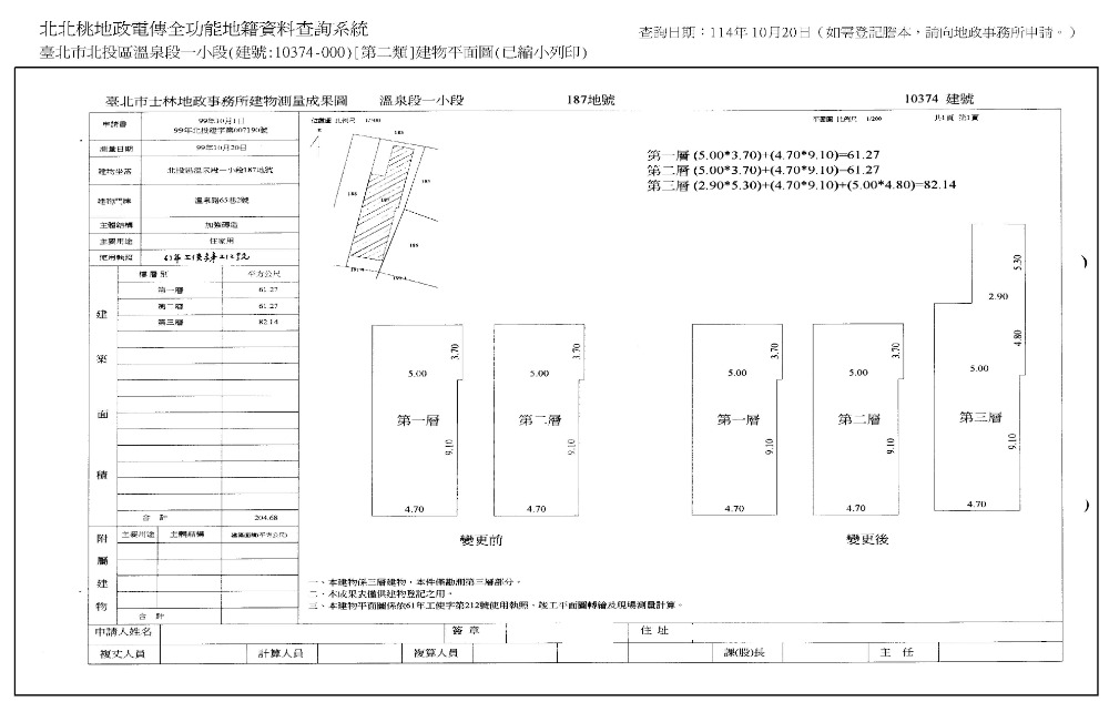 2‧另10374建號之1樓、2樓、3樓及3樓頂層增建部份(即本件拍賣標的,已經地政事務所編列臨時12716建號,座落地號為溫泉段一小段187地號,1樓、2樓、3樓及3樓頂層增建部分面積約分別為50.42平方公尺、52.26平方公尺、35.39平方公尺、42.21平方公尺,權利範圍為全部)。12716建號係未辦保存登記之建物增建部份,拍定後無法以權利移轉證書辦理建物登記(另請注意,此部分如經主管機關認定為違建,則有遭拆除風險,此部分請應買人慎重列入評估),且本件拍賣物以建物現況拍賣,當事人及拍定人均不得以面積不符,請求增減價金。